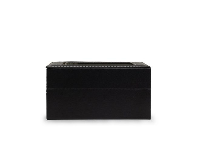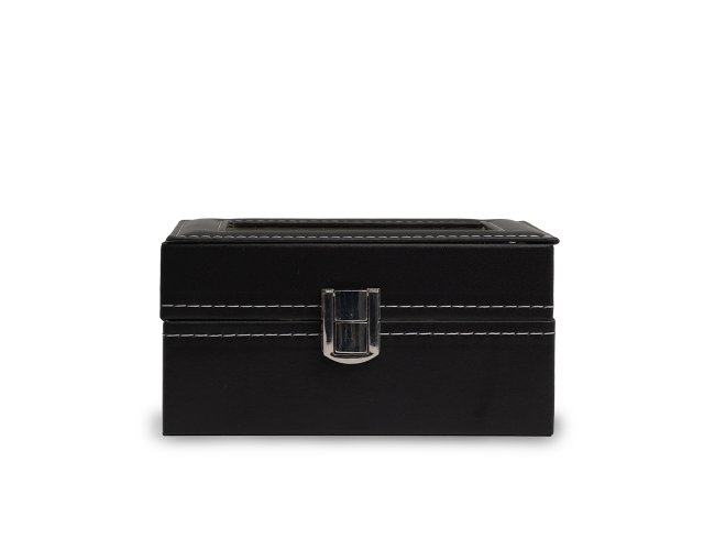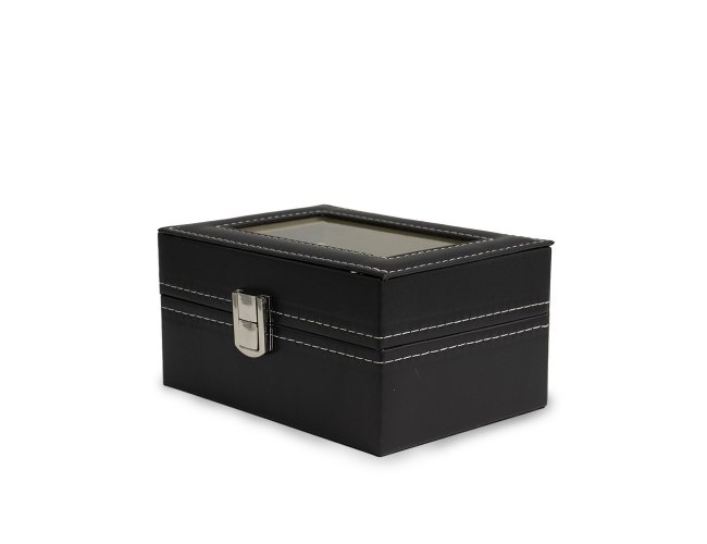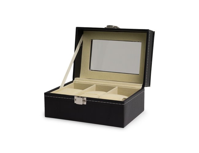 Porta relógios em couro sintético com revestimento aveludado. Possui três divisórias com almofadas para relógios, visor em acrílico e fechadura com trava.