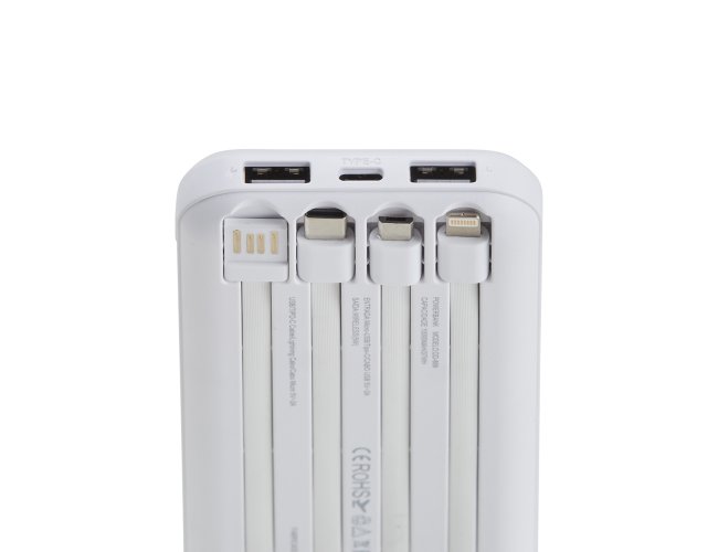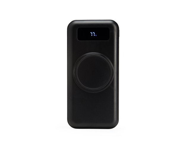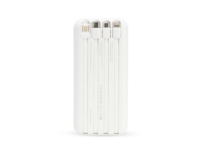 Carregador portátil power bank com 10.000mAh e carregamento via indução ou via cabo. Com display digital indicador de bateria, o carregador contém quatro cabos acoplados: Lightning, Tipo-C, V8 e saída USB para o carregamento da própria bateria. Portas de entrada: V8, Tipo-C e duas portas USB.