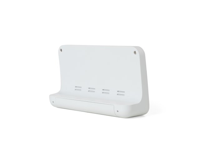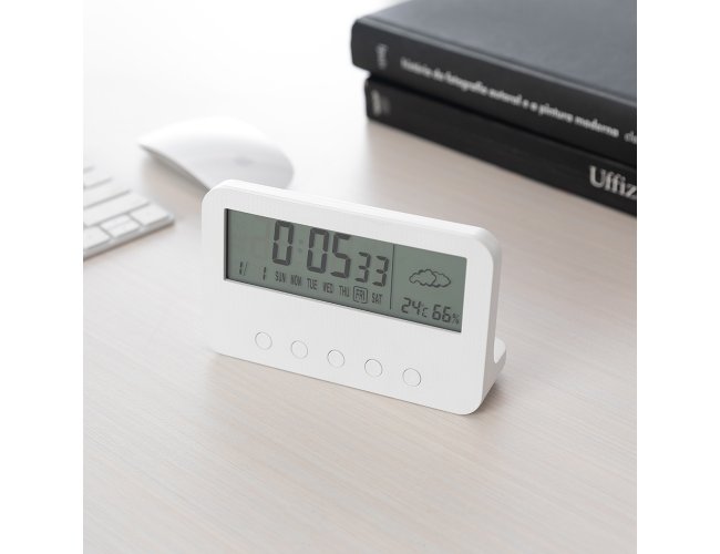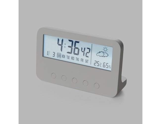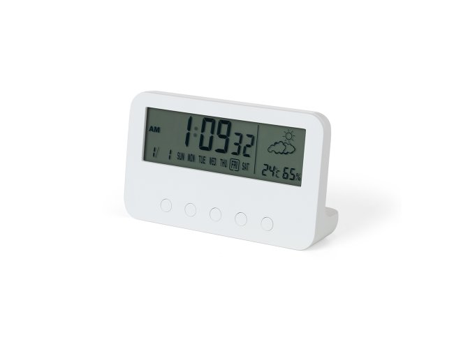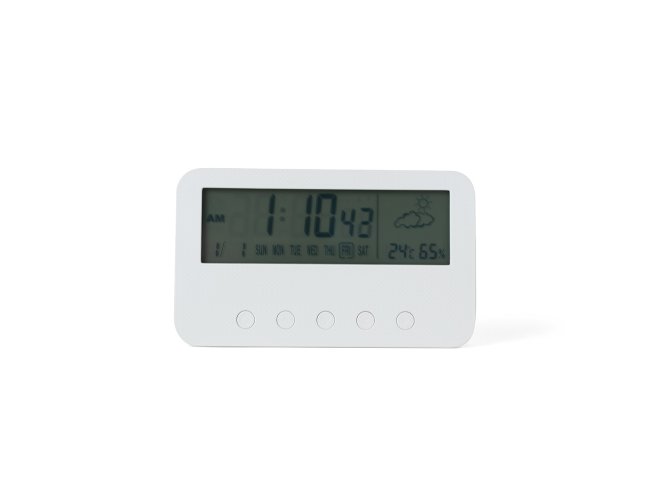 Relógio digital com alarme. Produzido em plástico, o relógio possui um display LCD com exibição das horas, dias da semana, data, alarme, relógio de contagem progressiva e regressiva, temperatura, clima e umidade, parte frontal inferior com botões para ajustes, e parte traseira com compartimento para 2 pilhas AAA (não acompanha). Acompanha manual de instruções em inglês