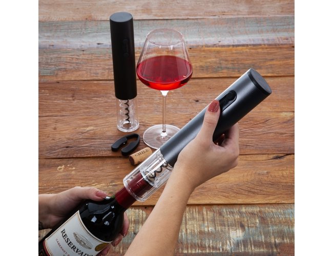 Saca-rolhas elétrico com LED e cortador de lacre. Parte superior em alumínio e parte inferior acrílica, possui compartimento superior com tampa para 4 pilhas AA (não acompanha pilhas), painel com iluminação LED e botões para extração e remoção de rolhas. No modo extração a área acrílica é iluminada pelo LED. Acompanha cortador de lacre. OBS.: Não afundar o produto na água ou qualquer outro tipo de líquido.