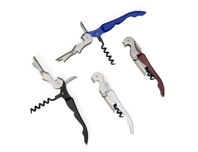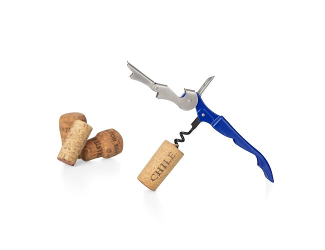 Saca-rolhas metálico de 2 estágios com acabamento fosco. Contém abridor de garrafa, lâmina de corte e saca-rolhas.