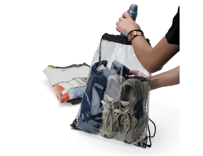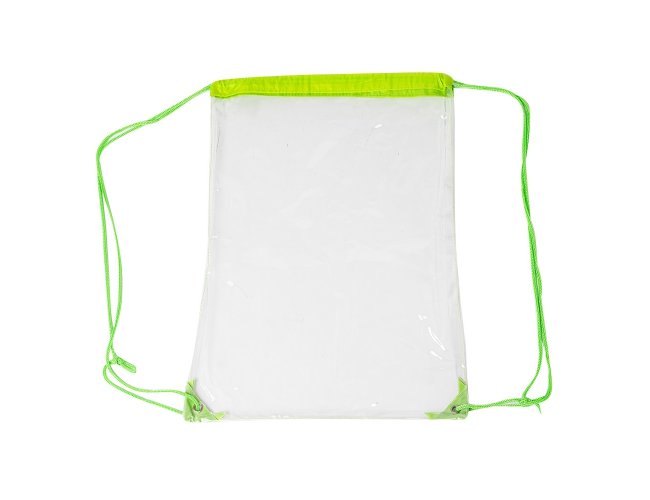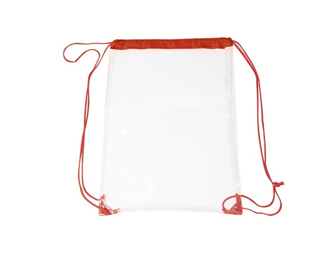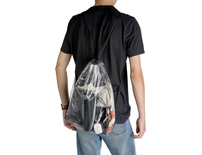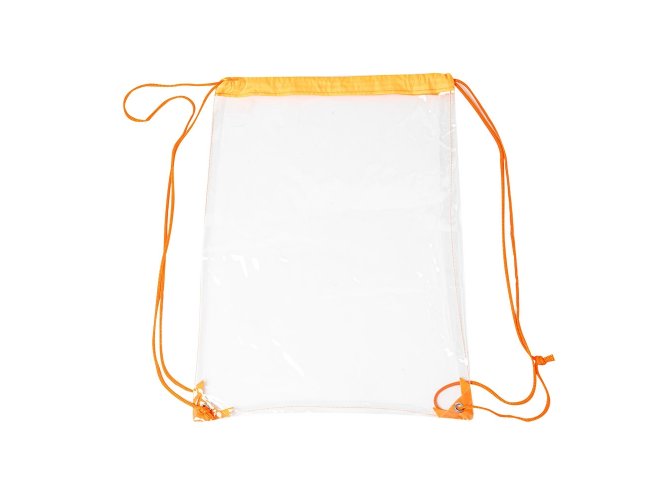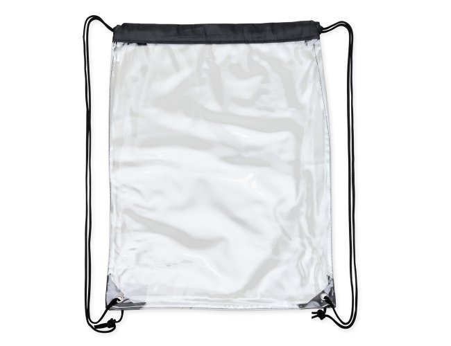 Sacochila em PVC transparente com detalhes em tecido nylon, alças reguláveis e dois ilhós metálicos.