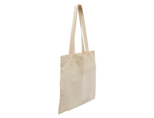 Sacola de algodão 210g/m² com 16 fios e alças costuradas na parte interna.