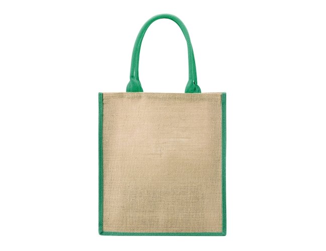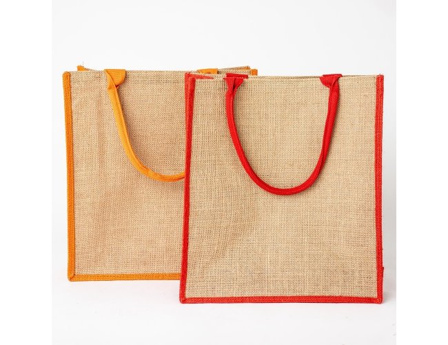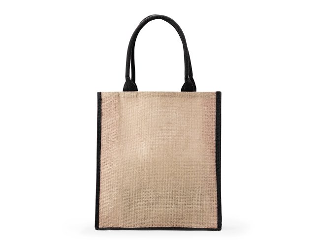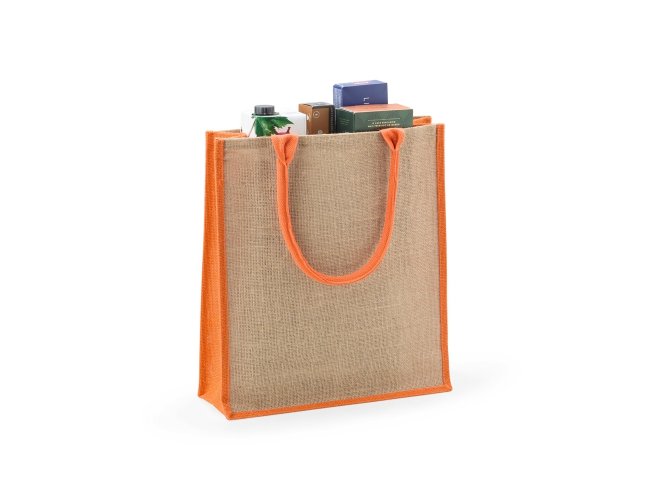 Sacola ecológica confeccionada em juta com alças costuradas na parte interna.