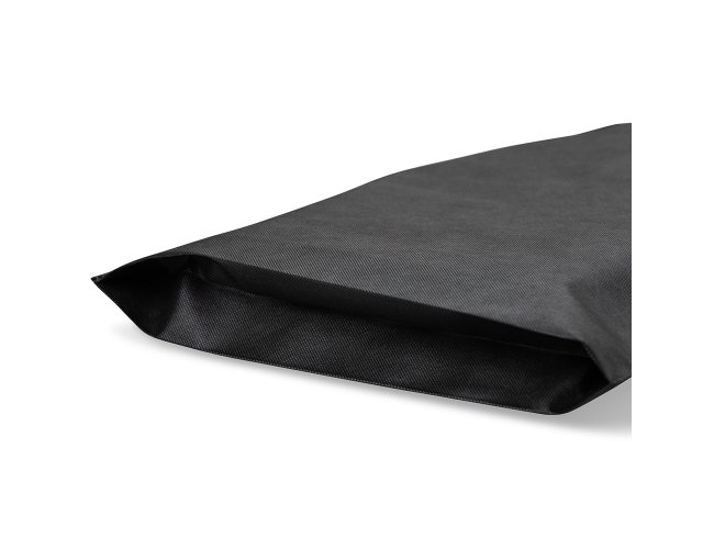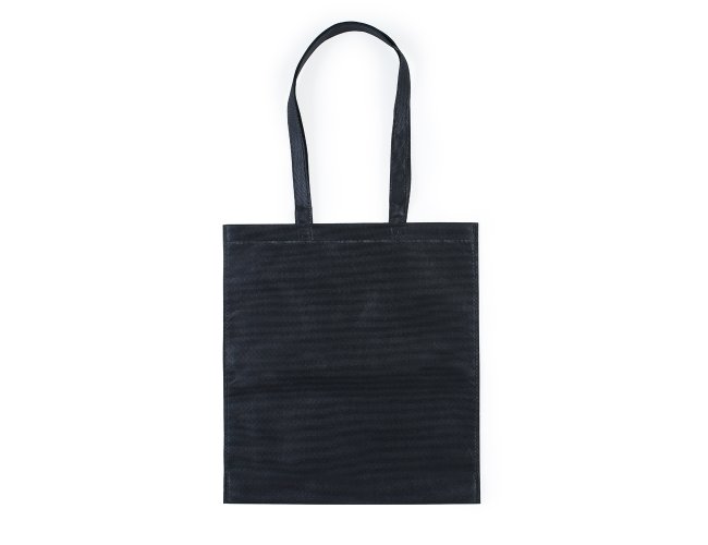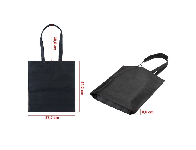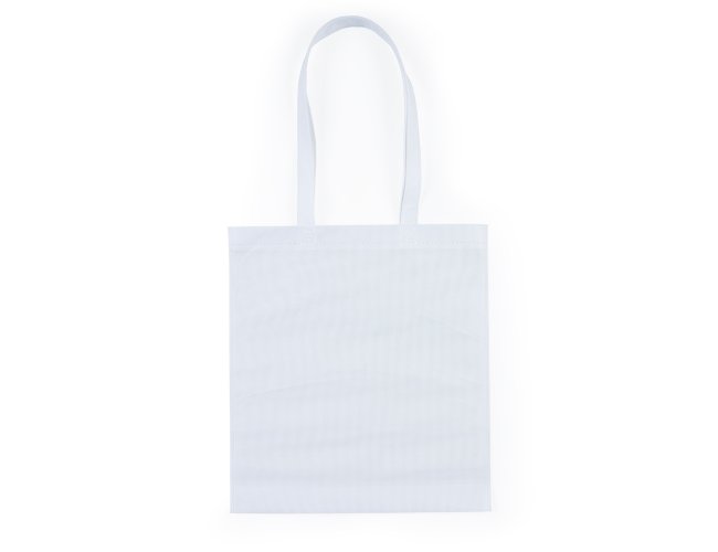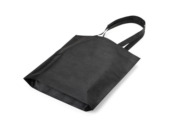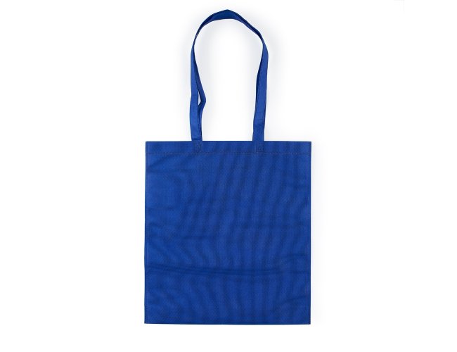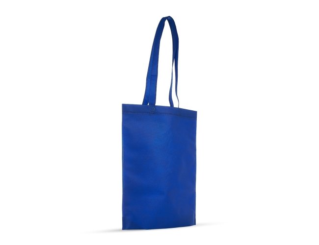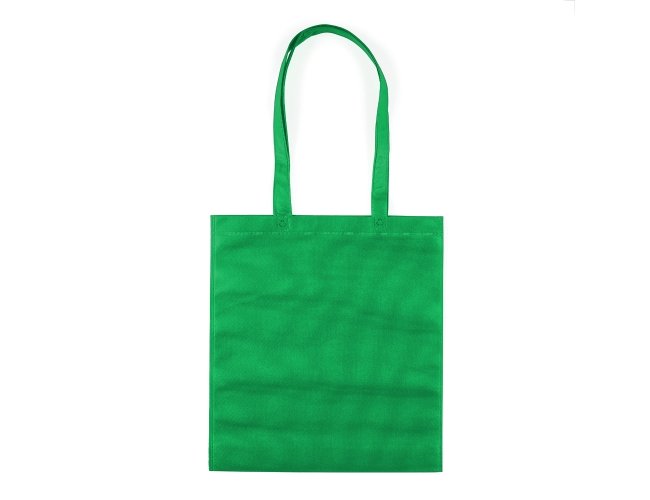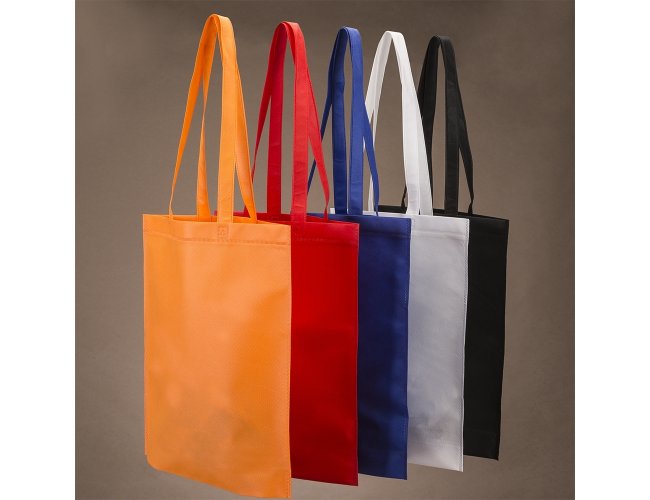 Sacola colorida com alça em material TNT, possui símbolo ecológico/reciclável na costura da alça.