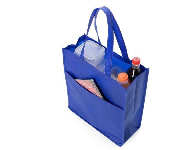 Sacola ecológica com bolso frontal externo e fundo amplo, contém alças para transporte.