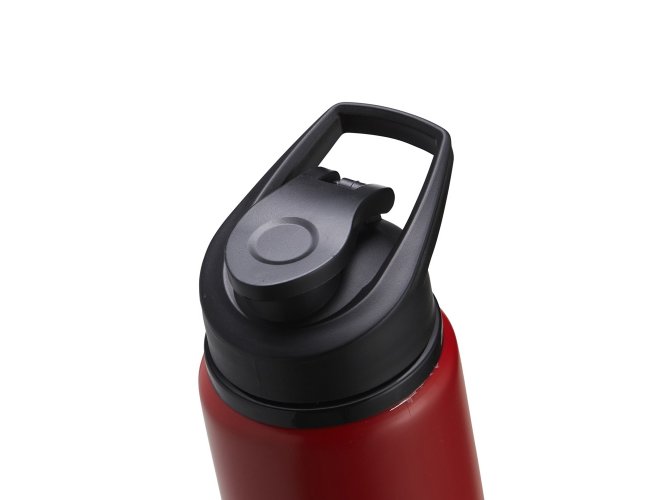 Squeeze de alumínio com capacidade de 650ml com acabamento leitoso fosco, contém tampa plástica rosqueável, alça e tampa protetora para o bocal.