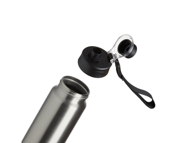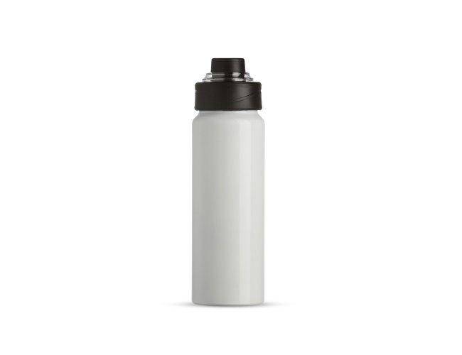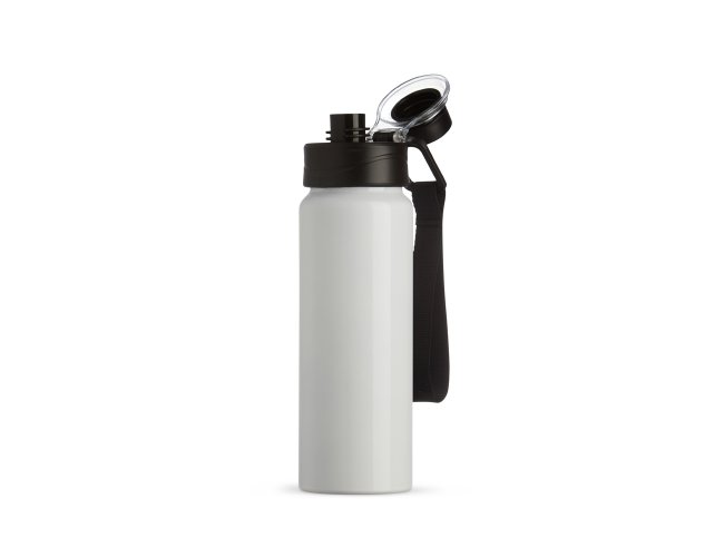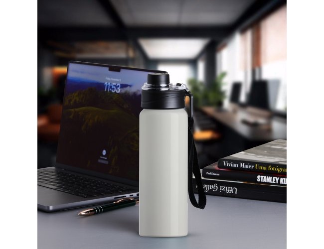 Squeeze Alumínio 800ml, possui tampa rosqueável com proteção para bocal plástica e alças de nylon e plástica.