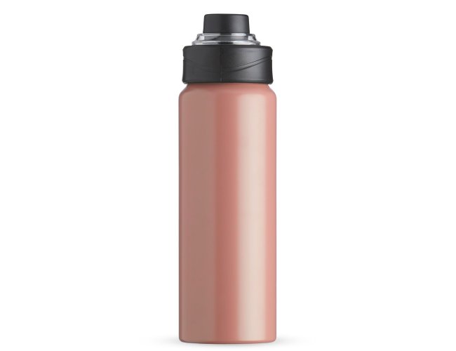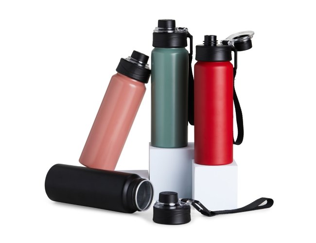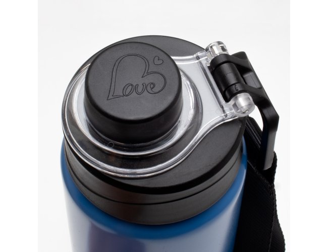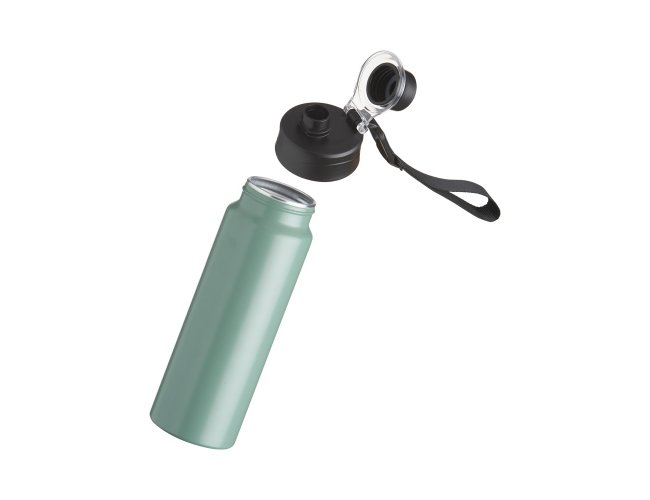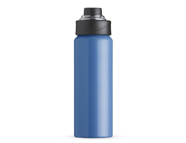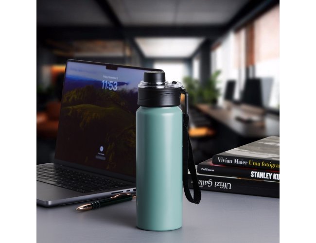 Squeeze Alumínio 800ml, possui tampa rosqueável com proteção para bocal plástica e alças de nylon e plástica.