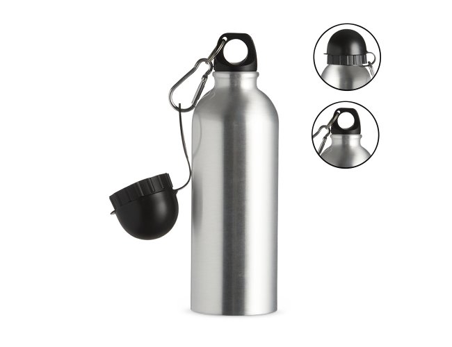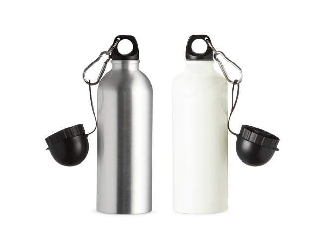 Squeeze 500ml de alumínio com acabamento para sublimação, tampa rosqueável e acompanha um segundo bico com mosquetão (não é térmico).