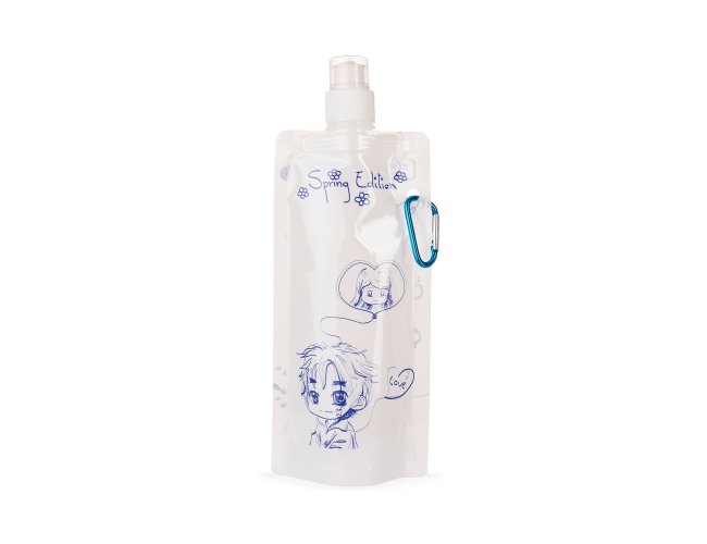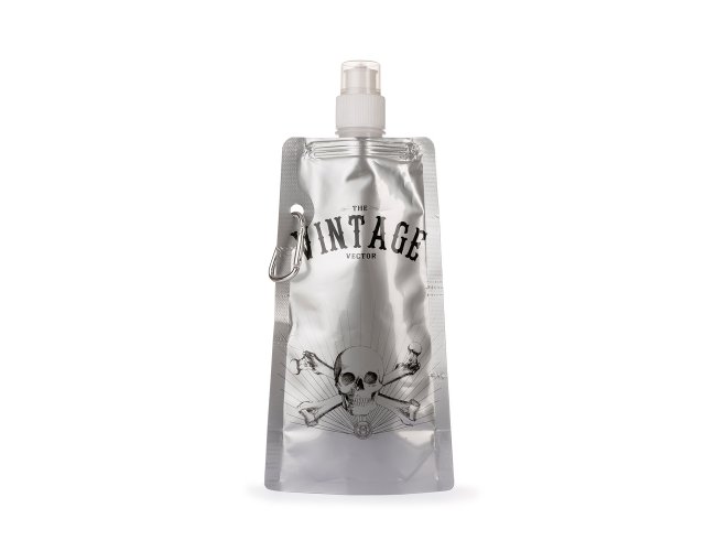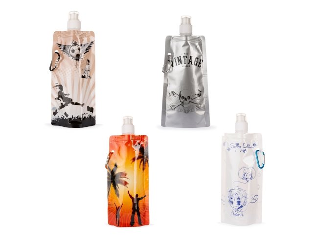Squeeze dobrável plástico com capacidade de 450ml, contém tampa de proteção para o bico e acompanha mosquetão.