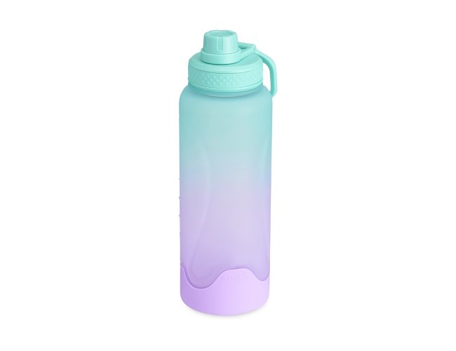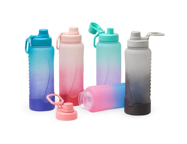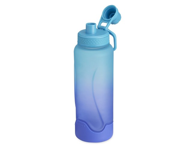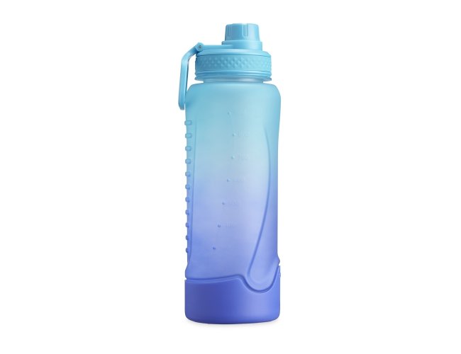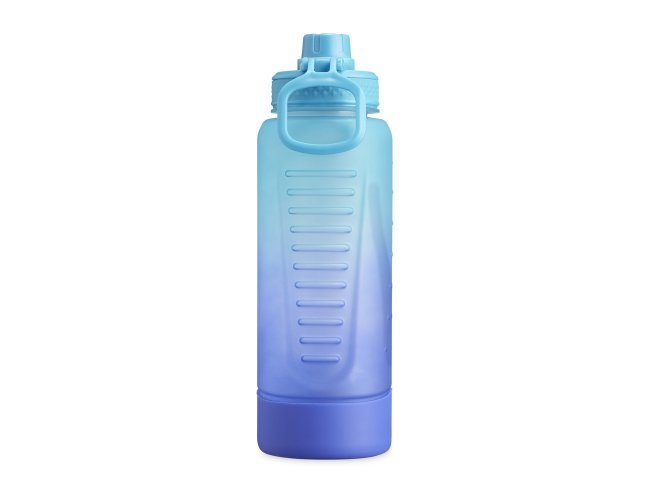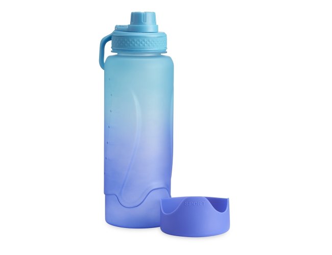 Squeeze plástica 1,1 litros com base de silicone anti-impacto (removível). Tampa com alça para transporte e tampa de proteção para o bocal.