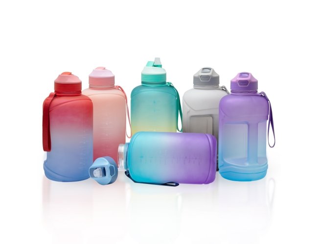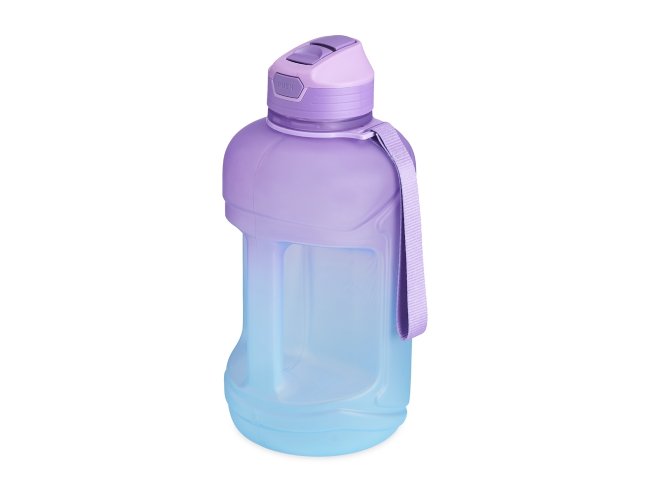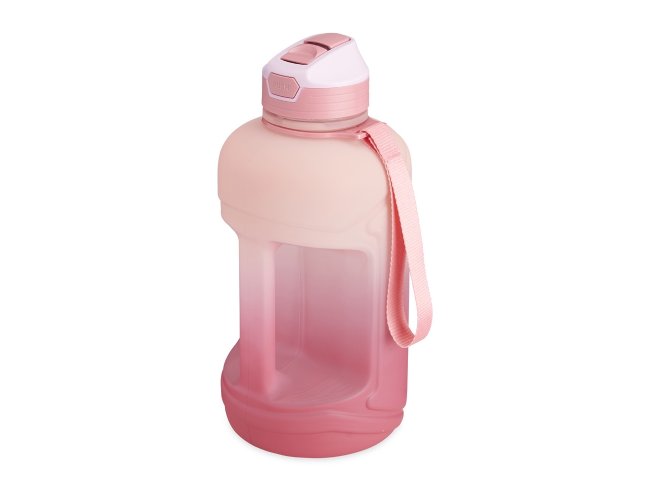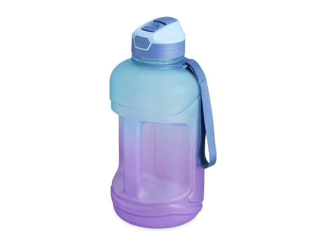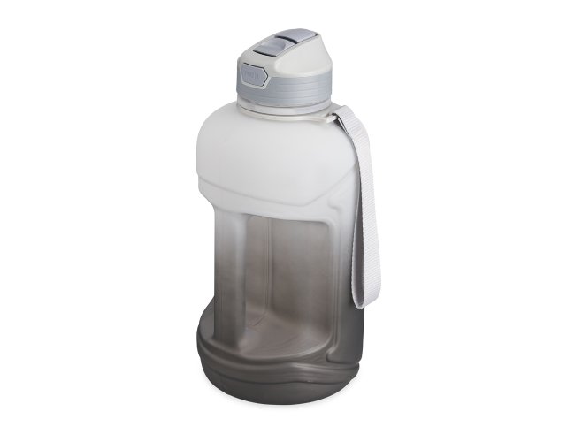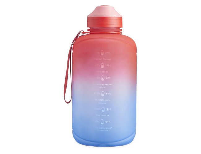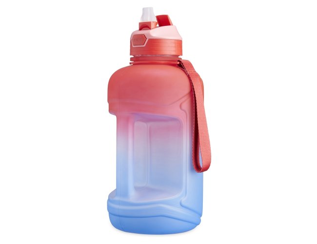 Squeeze PETG 2,2 litros com bico flip de silicone. Livre de BPA, a garrafa contém tampa com botão de acionamento para o bico com capa protetora, canudo acoplado e alça para transporte.