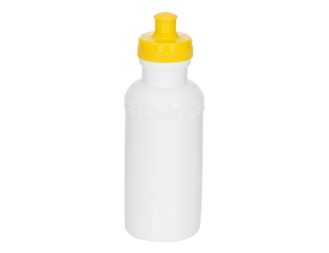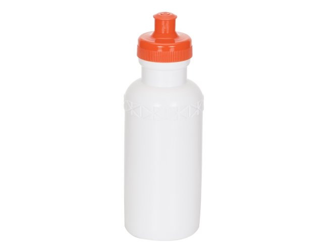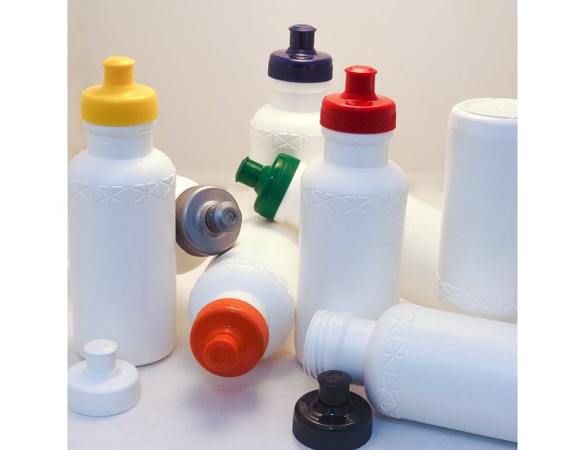 Squeeze 500ml de plástico resistente, possui detalhe em relevo na parte superior e tampa de bico(plástico) rosqueável.