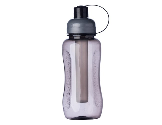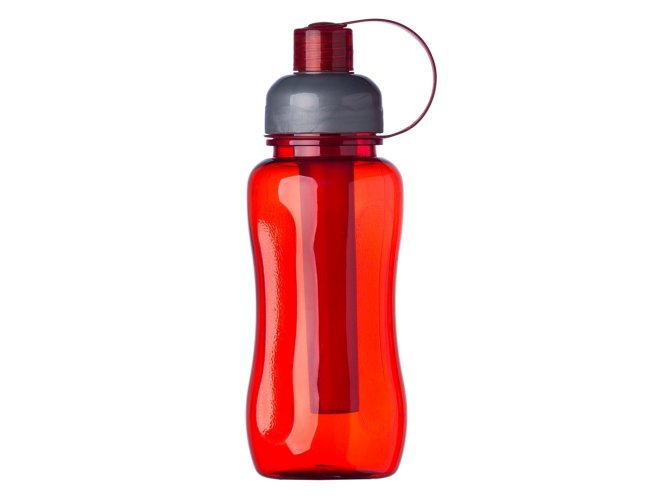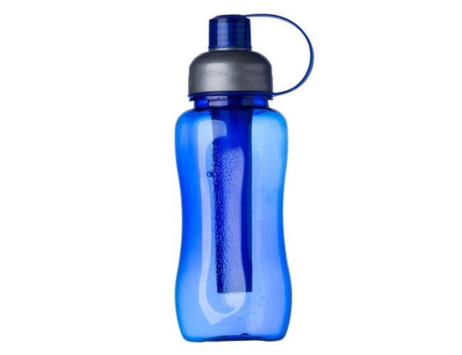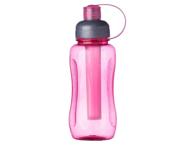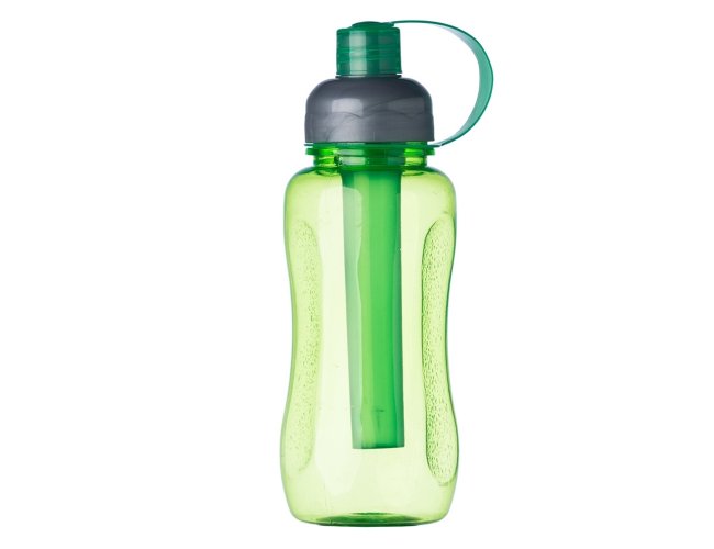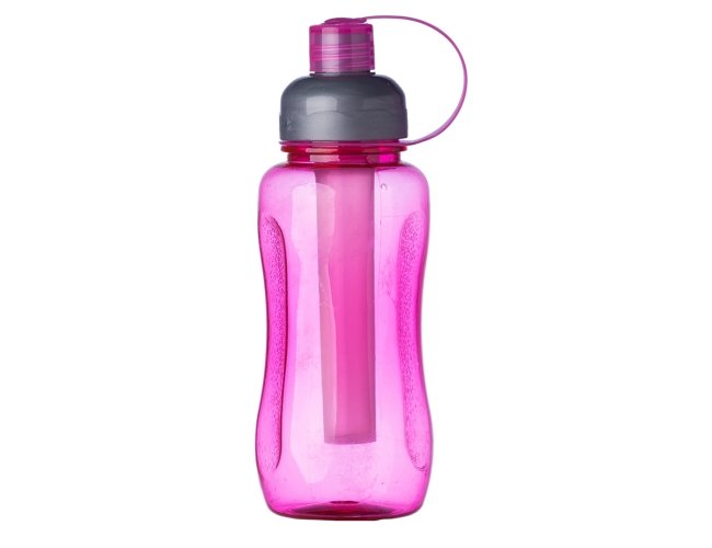 Squeeze plástico 600ml ice bar. Squeeze colorido acinturado com detalhe retangular texturizado nas laterais, possui tampa cinza com detalhe ondulado ao redor e tampa com alça para o bico. Parte interna possui uma barra congelante(desencaixe a barra da tampa), encha a barra e coloque no congelador/freezer para gelar e depois é só colocar novamente no squeeze.