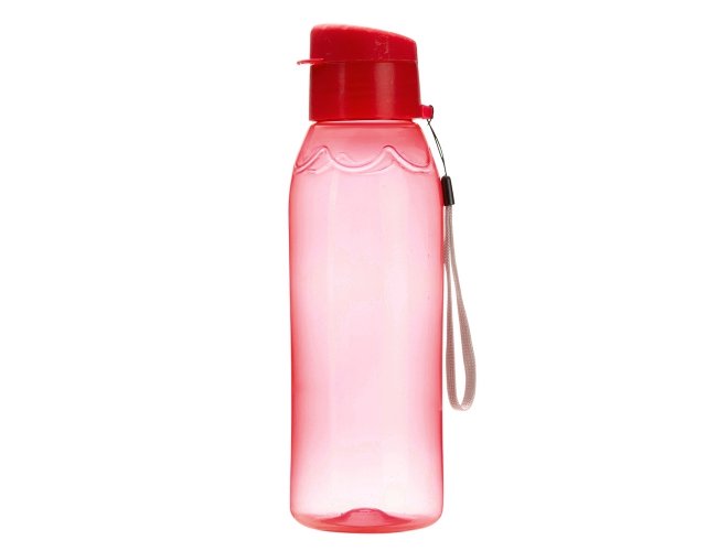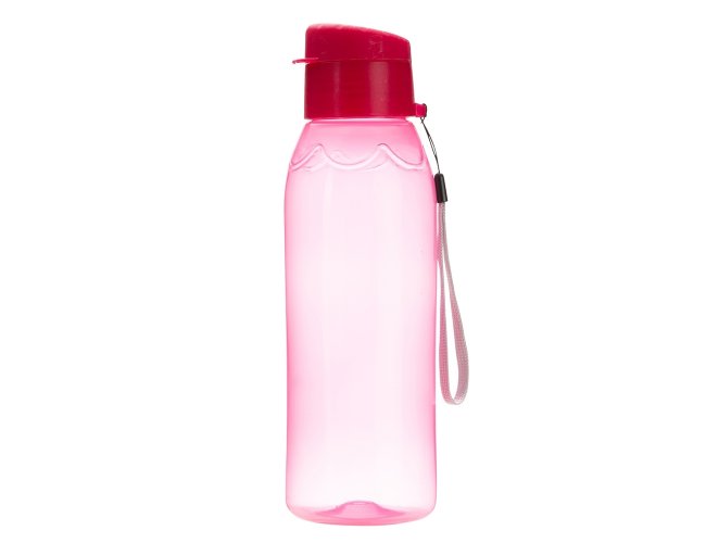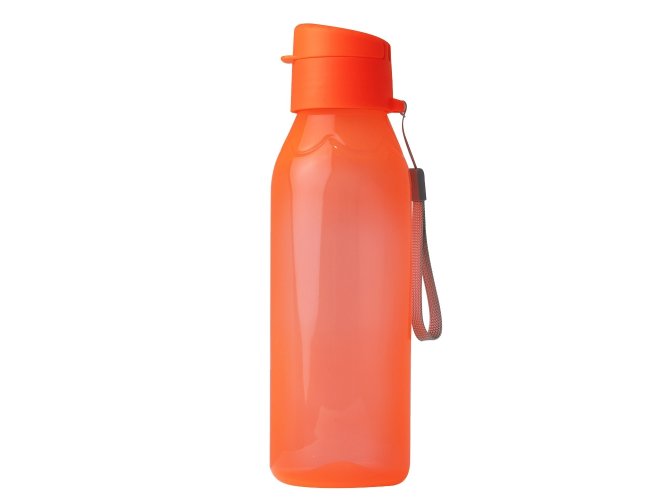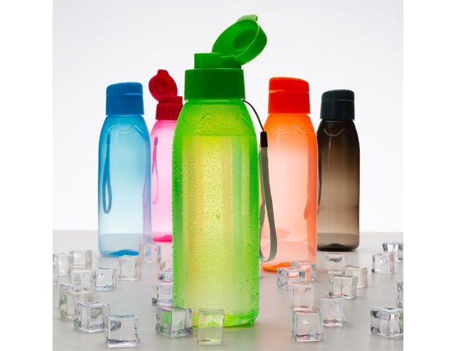 Squeeze plástico 700ml livre de BPA. Corpo de polipropileno transparente colorida com detalhe superior em relevo, possui tampa rosqueável com abertura de bocal. Acompanha alça de nylon, pode ser encaixado no suporte da tampa.