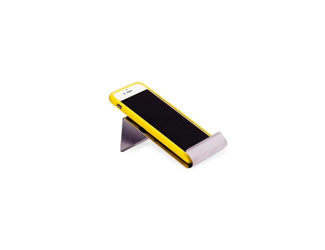 Suporte em inox espelhado, ideal para apoiar celulares em superfícies planas.