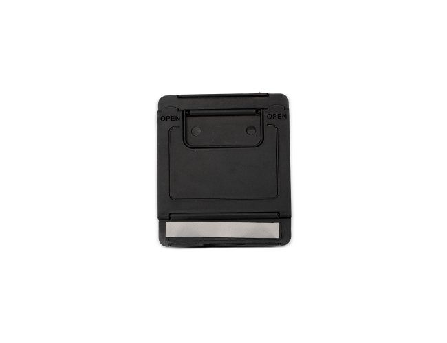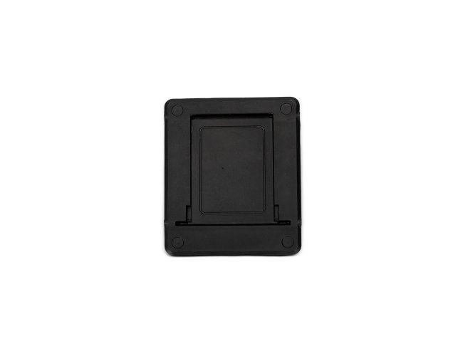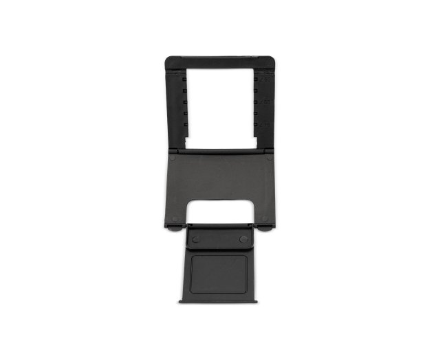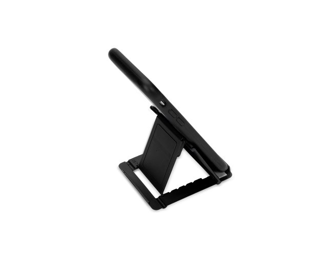 Suporte para celular compacto feito em plástico. Ideal para superfícies planas, possui ajuste de inclinação de até 75 graus. Conta também com almofada emborrachada antiderrapante para oferecer um apoio mais estável ao aparelho durante o uso.