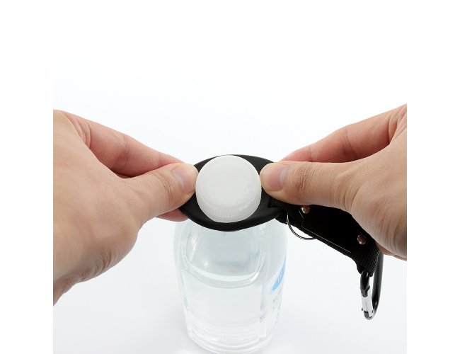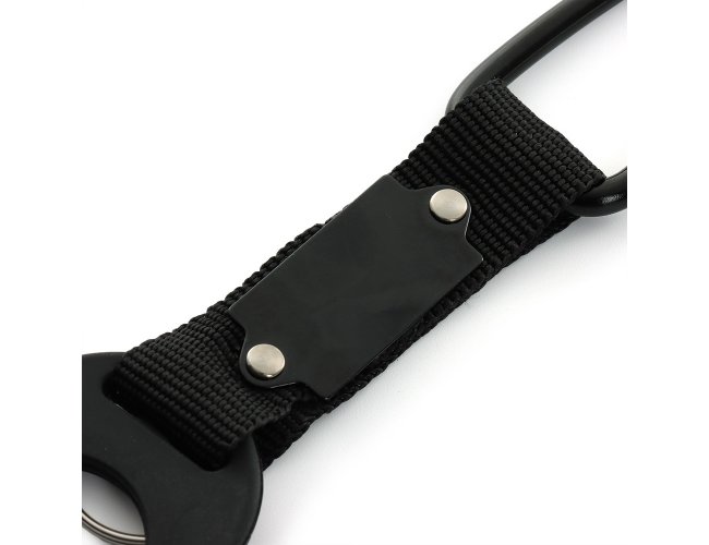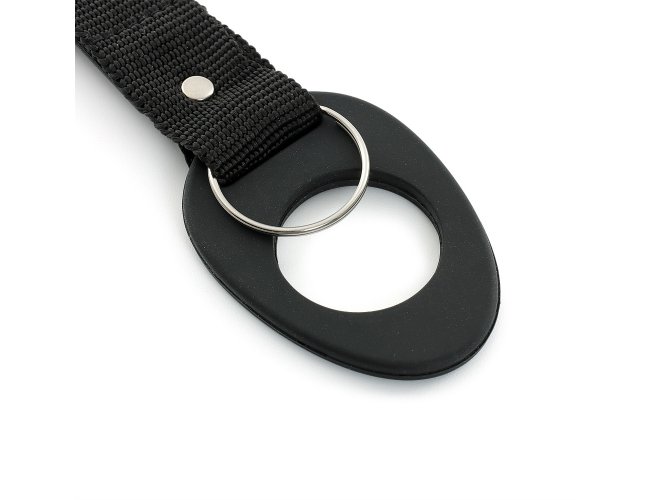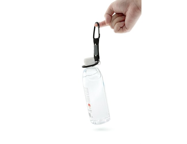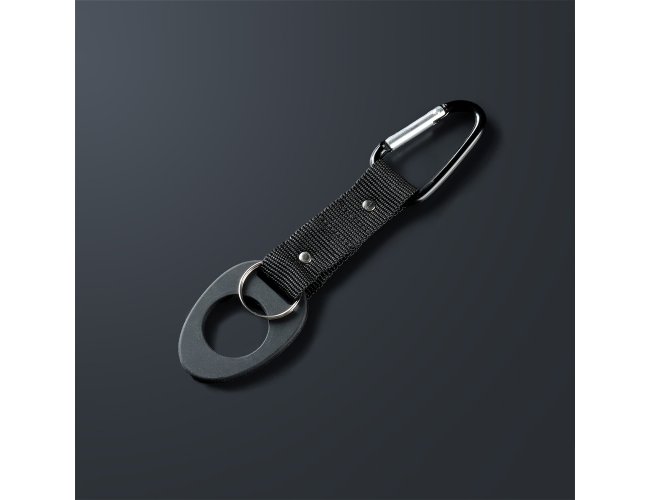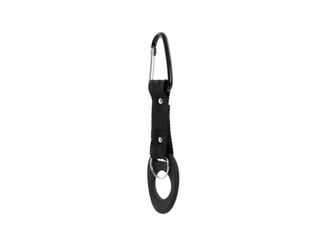 Suporte formado por uma alça de nylon ligada a um anel maleável, próprio para encaixe em bocais de garrafas PET. Em uma ponta, conta com o anel, e na outra, com mosquetão e argola para chaveiro.
