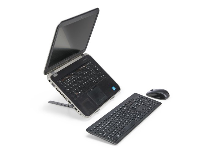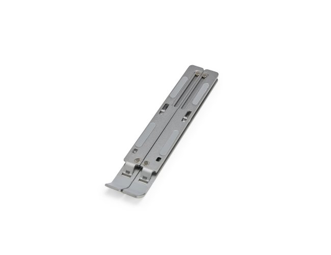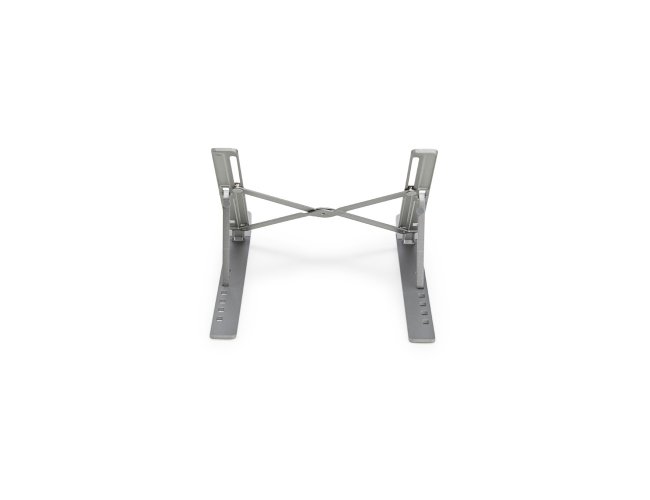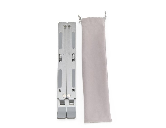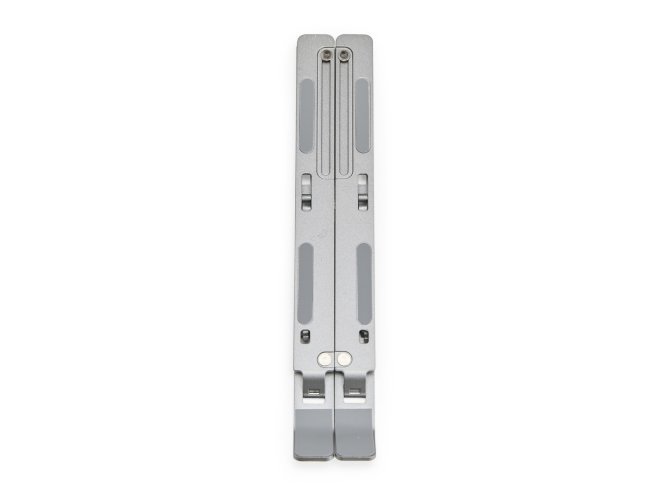Suporte retrátil para notebooks feito em metal resistente. Possui design aberto para facilitar a dissipação de calor, sete níveis de ajuste para notebooks de até 15,6 polegadas e tiras de silicone laterais que garantem maior estabilidade ao dispositivo.