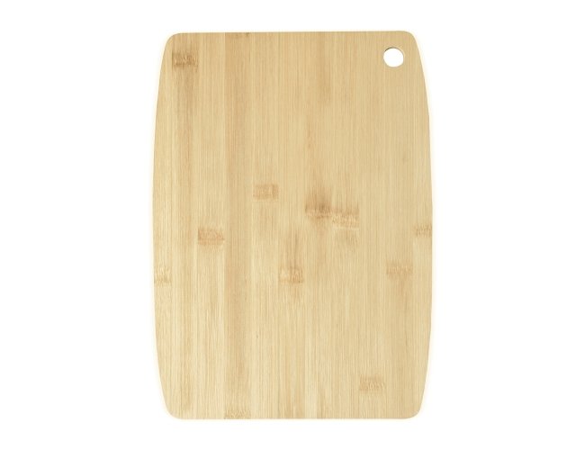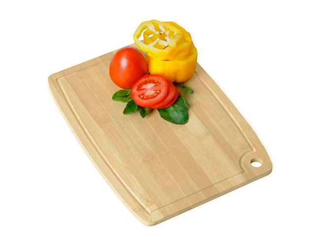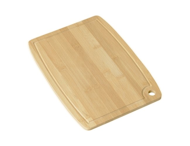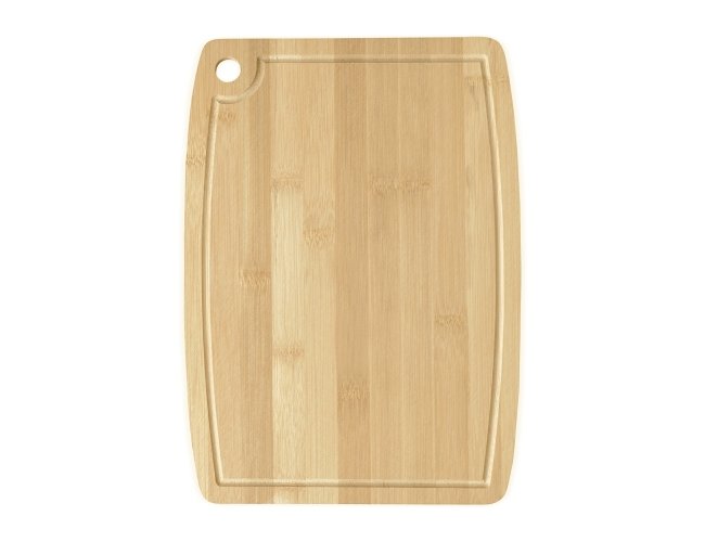 Tábua de corte em bambu com canaleta e acesso para gancho.