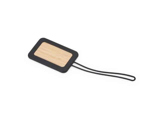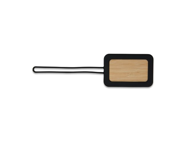 Tag identificador de bagagem de Bambu e silicone. Parte frontal com área de identificação e verso liso para personalizações.