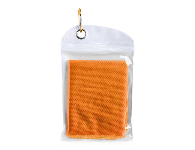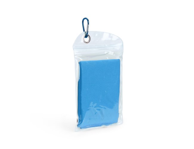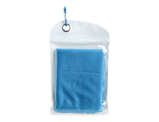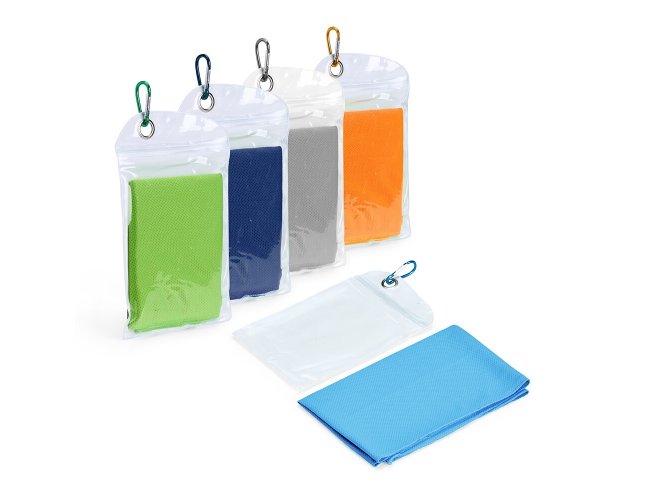 Toalha refrescante feita em elastano, ideal para aliviar o calor. Para ativar o resfriamento, basta molhar a toalha, torcê-la levemente e colocá-la no pescoço para aproveitar a sensação refrescante. Acompanha embalagem reutilizável em PVC com mosquetão para transporte.