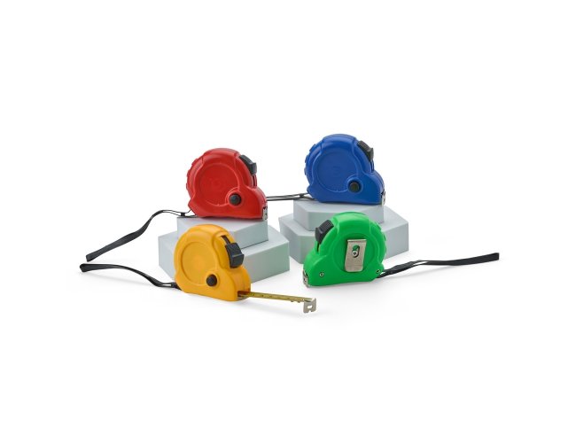 Trena com corpo e presilha em plástico e alça de borracha. Possui fita de aço com alcance máximo de 5 metros, também com marcação de medidas em pés e polegadas. Conta com trava de segurança e botão manual que mantém a fita em posição fixa.